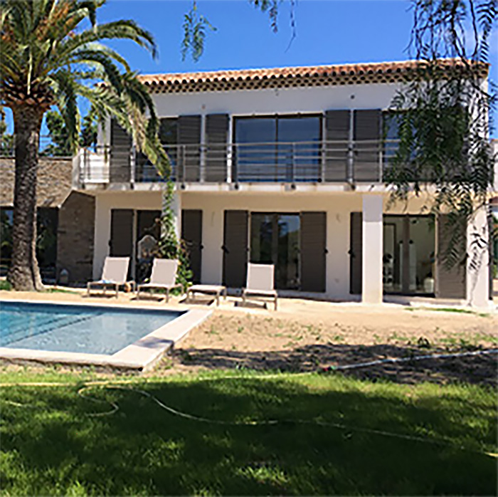 Après rénovation, la maison bénéficie d’une nouvelle organisation des volumes et d’une façade contemporaine, rythmée par de grandes baies vitrées favorisant la lumière naturelle et l’ouverture sur le jardin.